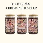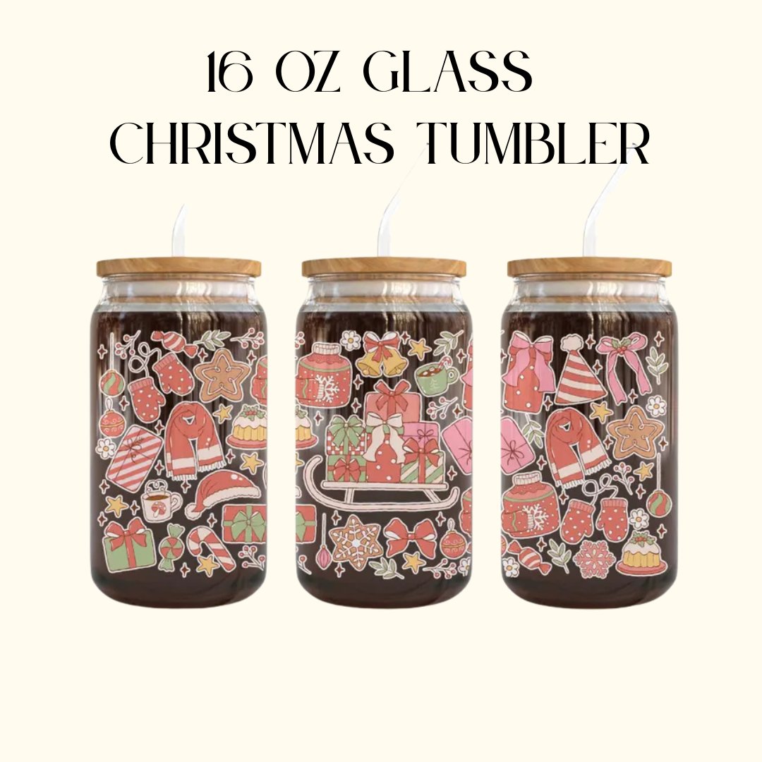 A festive 16oz glass tumbler with a matching lid and glass straw, featuring a girly Christmas design. Listing is for ONE tumbler only (even if multiple are shown in photos). Perfect for holiday drinks or gifting.