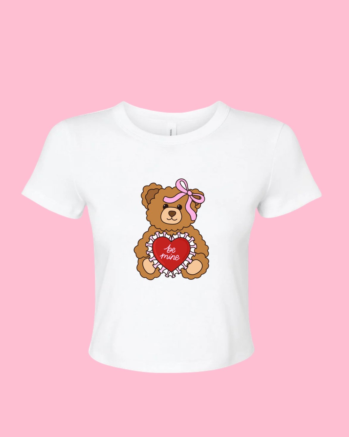 White baby tee featuring a cute “Be Mine” teddy bear design, perfect for Valentine’s Day. Flattering, fitted baby tee style with a soft, comfortable feel that’s easy to dress up or down. Sweet, playful, and perfect for gifting or treating yourself.