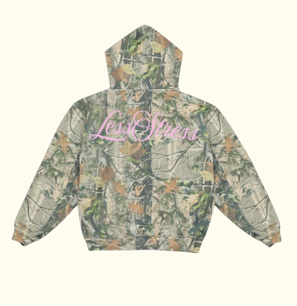 Not your average camo. This zip-up hoodie is built for the bold. Featuring a gritty, oversized fit and custom Lesstress pink print, it’s made to turn heads while keeping you grounded. Heavyweight feel, soft fleece inside, and a street-ready silhouette—this jacket is made for movement, mood, and making a statement.