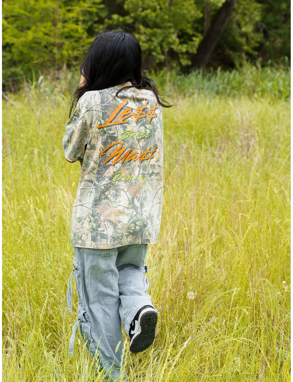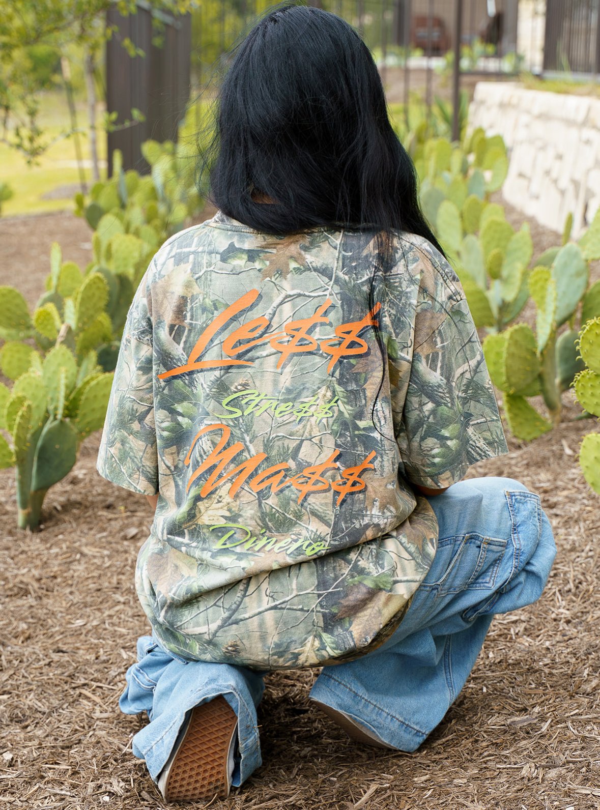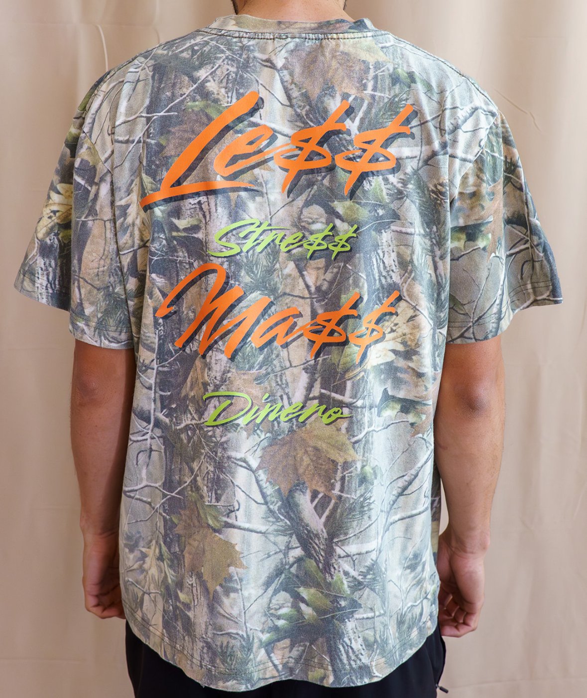 Upgrade your streetwear with this bold LESSTRESS MÁS DINERO design printed in a bright orange pop on a vintage-style oversized camo tee. Perfectly slouchy, perfectly edgy — this tee gives effortless “don’t stress, get money” energy.