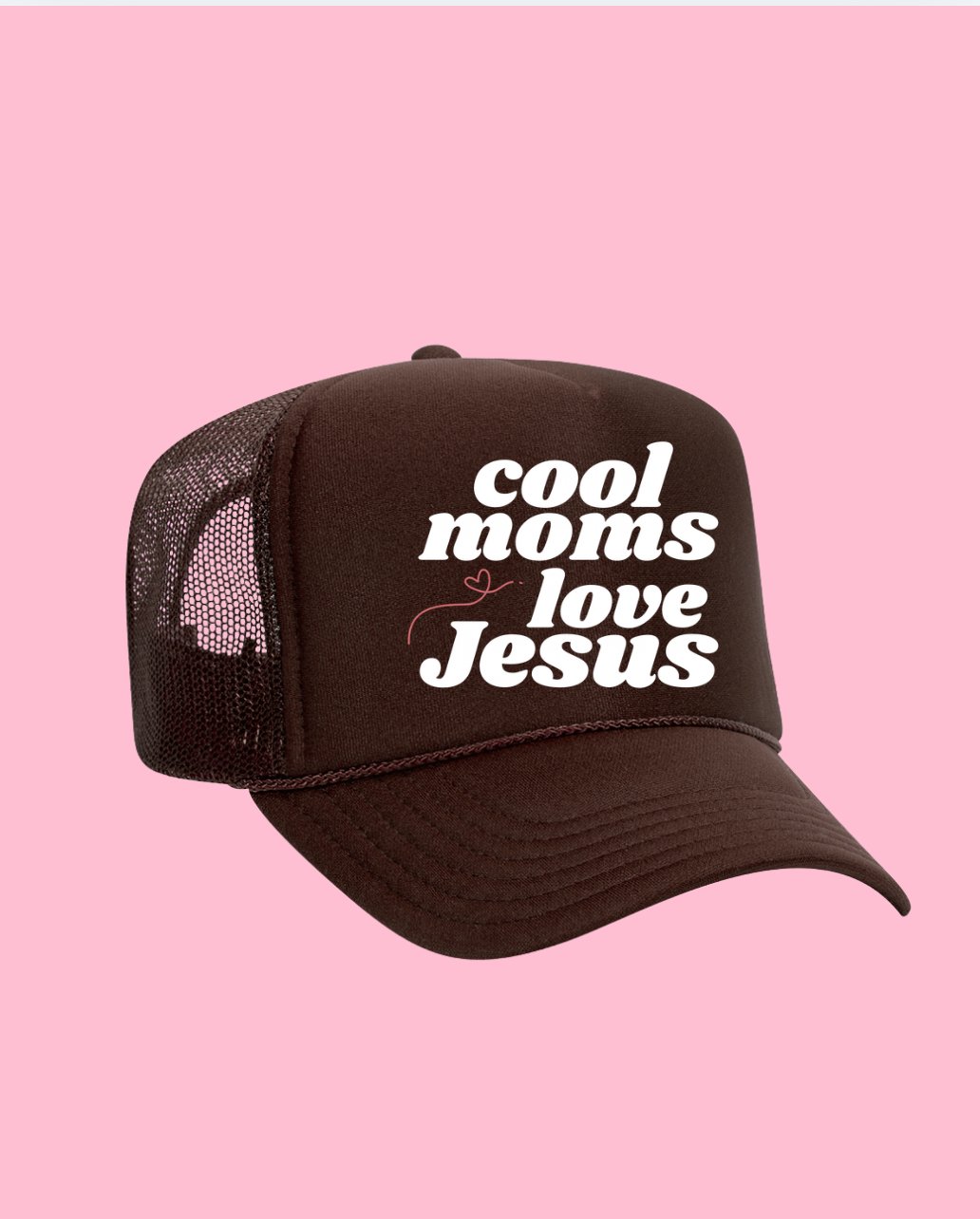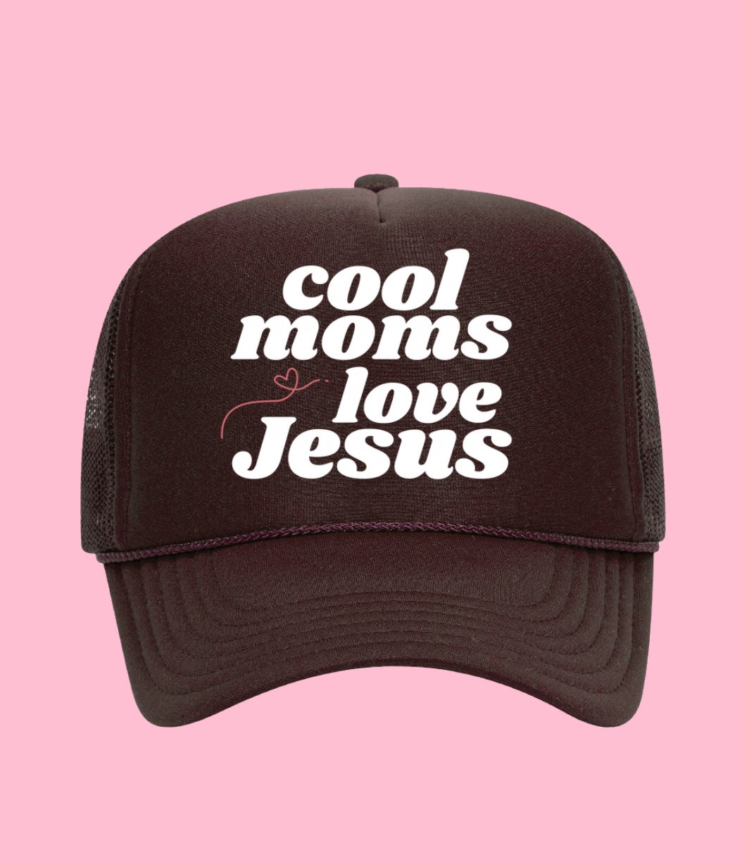 Brown trucker hat featuring a crisp white “Cool Moms Love Jesus” print. Classic trucker style with a breathable mesh back and adjustable snap closure for the perfect fit. Effortlessly cool, faith-forward, and perfect for everyday wear.