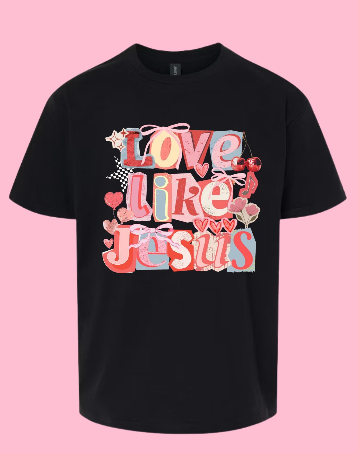 Black t-shirt featuring a “Love Like Jesus” design in bold magazine-style lettering. A statement piece with a modern, edgy feel while keeping a meaningful message. Soft and comfortable fit, available in sizes Small–2XL.