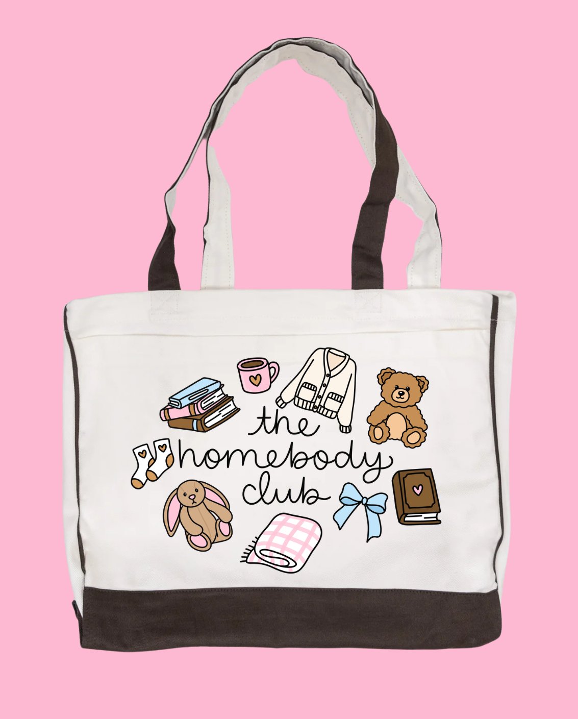 Our Homebody Club tote is the perfect everyday bag for cozy errands, bookstore runs, coffee dates, or carrying all your comfort essentials.