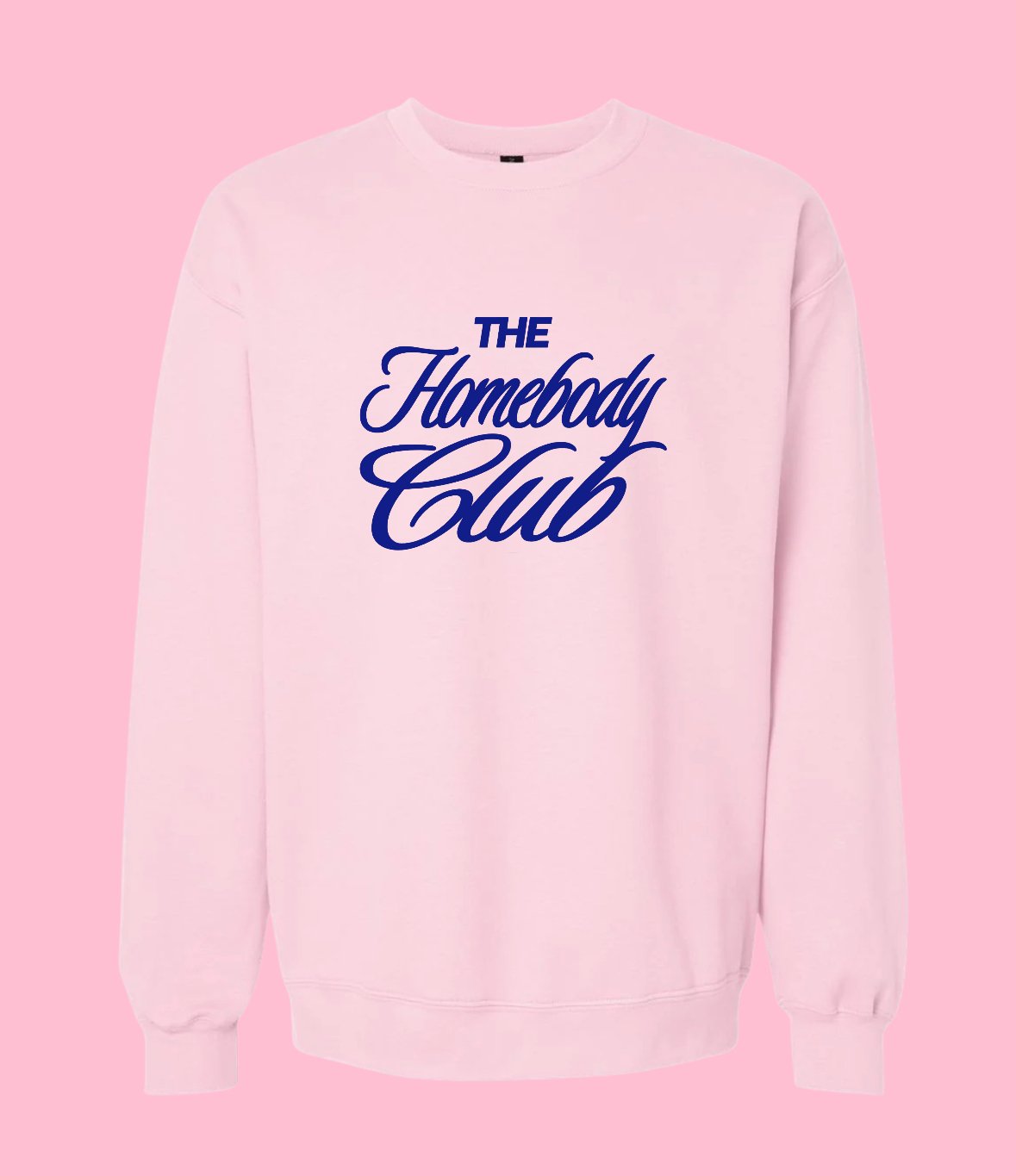 pink sweatshirt with “the homebody club” design on top, perfect everyday sweatshirt to run errands or just be cozy in!