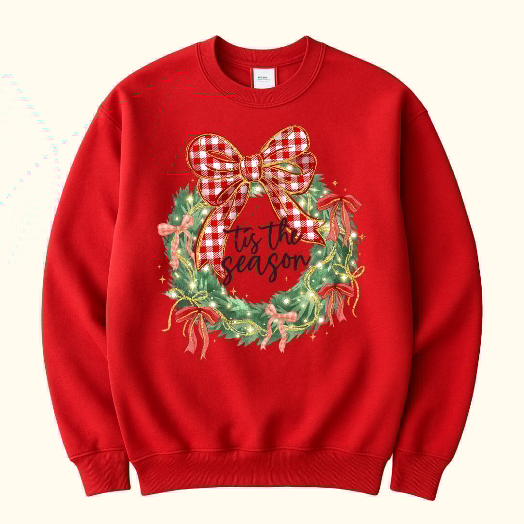 A festive red sweatshirt featuring a cute “’Tis the Season” graphic with a holiday wreath. Cozy, cheerful, and perfect for the Christmas season. Unisex fit, sizes S–XL.