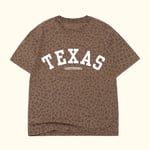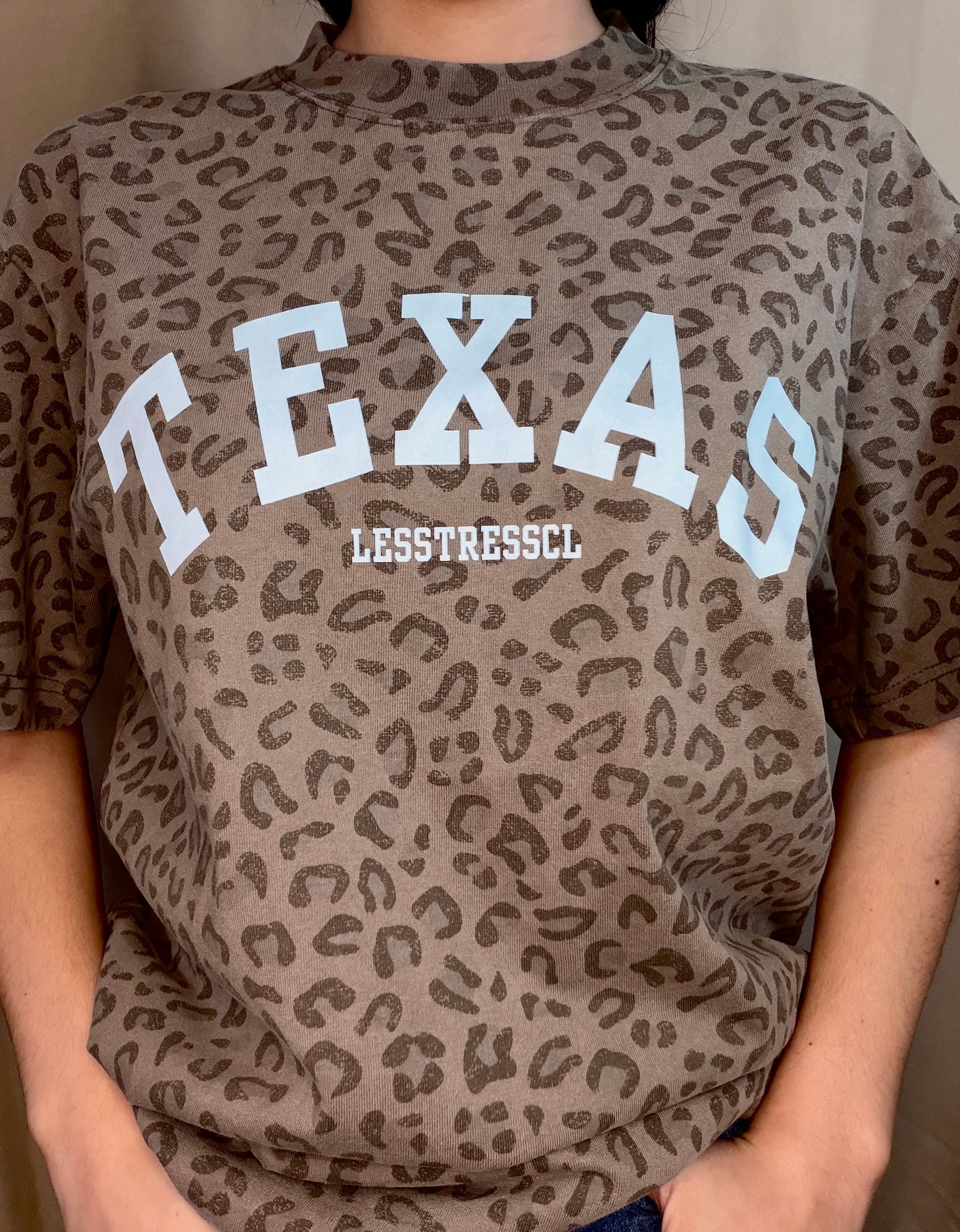 Show your Texas pride with a wild twist. This cotton tee features a bold leopard print background with “Texas” printed in crisp white lettering. Soft, breathable, and easy to style — it's perfect for everyday wear or game day fits.